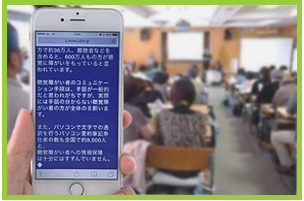 | 就業体験内容 | ★耳の聞こえに問題をお持ちの方が、何不自由なく暮らせる、「聴覚バリアフリー社会」の構築を目指すIT企業です★ ①会社及び業務内容の説明 ②「e-ミミサービス(耳の聞こえに問題をお持ちの方に対し、セミナーやシンポジウム、授業などで話者の内容をスマホ等で弊社センターに送付、文字通訳者がその内容を聴きながらPCに入力し、インターネットでリアルタイムに全文を配信するサービス)」の説明と体験 ③「電話リレーサービス(耳の聞こえに問題をお持ちの方が電話機能を使えるように、文字でやり取りをしながら代理で電話を行うサービス)」の説明と体験 |