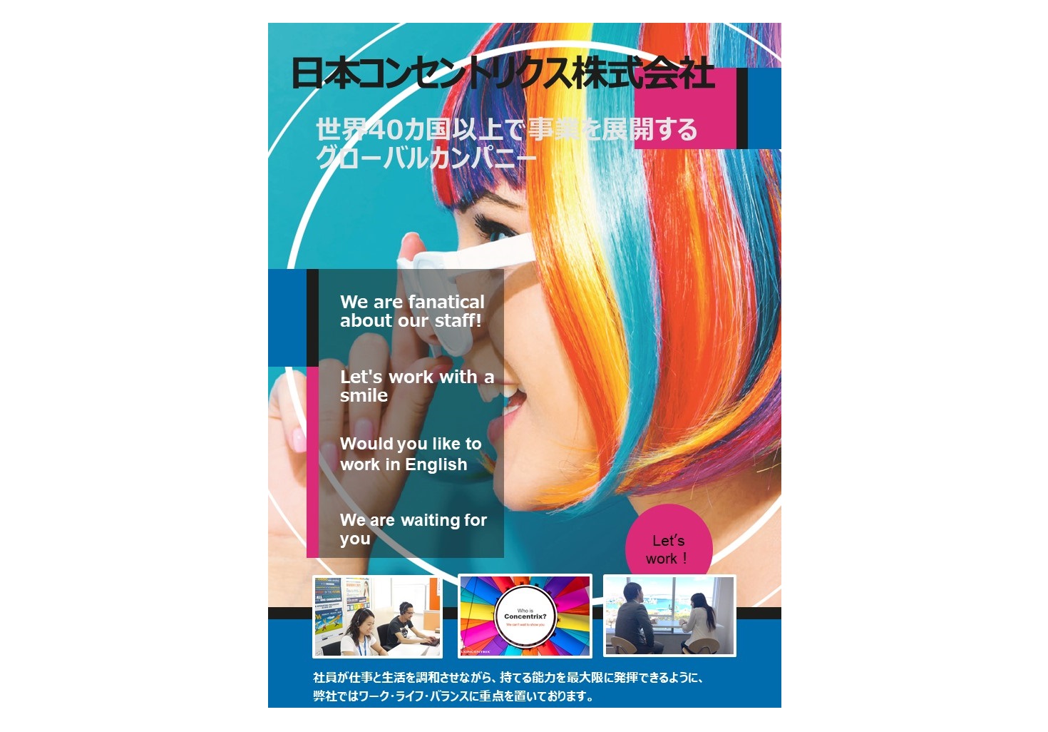 日本コンセントリクス(株)は世界を代表するコンセントリクスの高度なノウハウと経験を生かしたカスタマーケアBPOサービスを提供しています。社員の成長が企業の成長の源泉であるという考えに基づき充実した研修制度やキャリア形成を重視した会社です。 日本コンセントリクスが選ばれる理由をご紹介! <その1> 社内の雰囲気やスタッフ同士仲が良くアットホームな職場環境! <その2> 充実の研修制度♪研修を約1ヶ月のスケジュールで実施しており、コールセンター初めての方も安心してお仕事スタートできます! 随時、見学可能です♪是非、一度センター内にいらしてください!!
